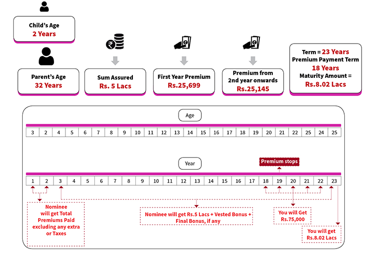 • On Maturity the child gets the Sum Assured along with Vested Bonus and Final Bonus, if any